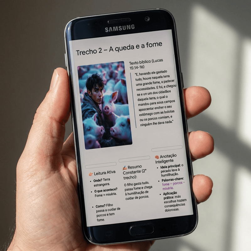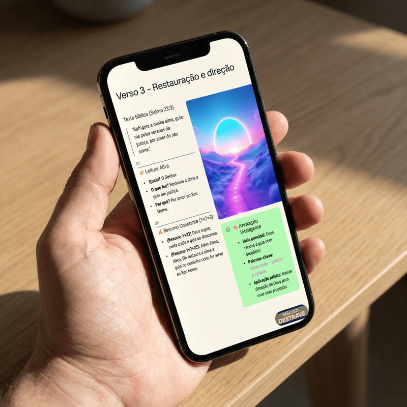 Aprenda a técnica da Leitura Ativa. Em vez de ler palavras isoladas, você aprenderá a enxergar a estrutura do capítulo em segundos. É como ter um GPS dentro da Bíblia.